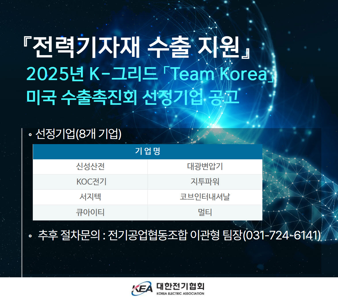 『전력기자재 수출 지원』 2025년 K-그리드 「Team Korea」 미국 수출촉진회 선정기업 공고