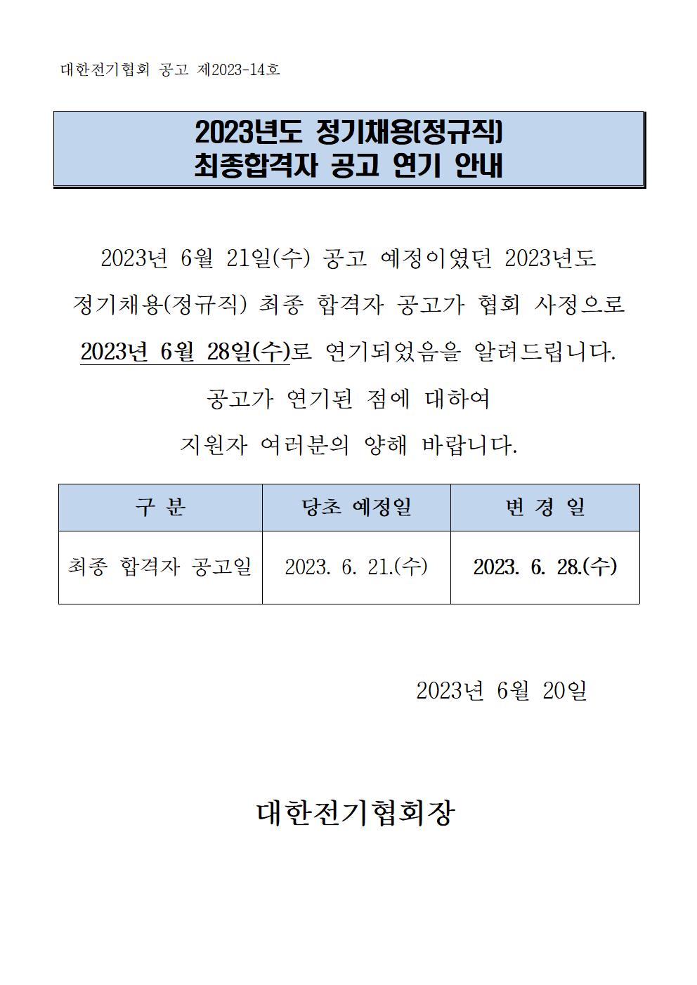 2023-14 : [최종합격자 공고 연기 안내] 2023년도 정기채용(정규직)