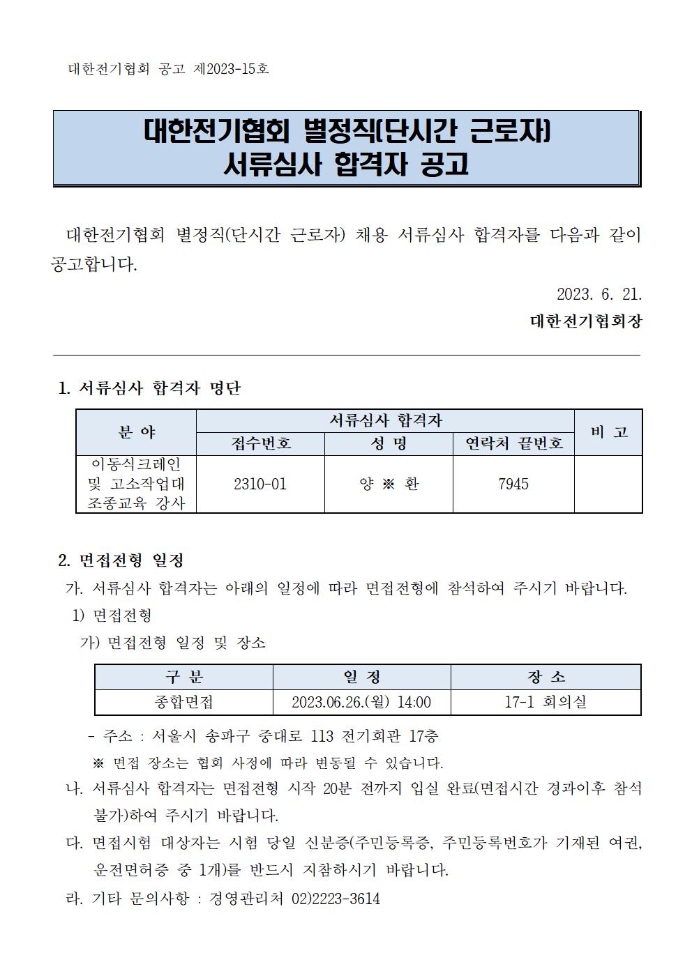 2023-15 : [서류심사 합격자 공고] 별정직(단시간 근로자)