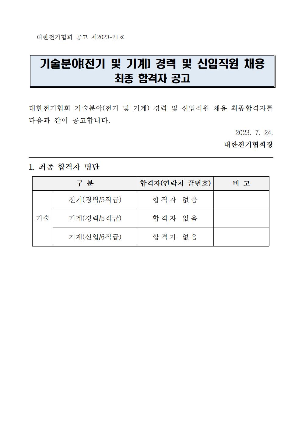 2023-21 : [최종합격자 공고] 기술분야(전기 및 기계) 경력 및 신입직원