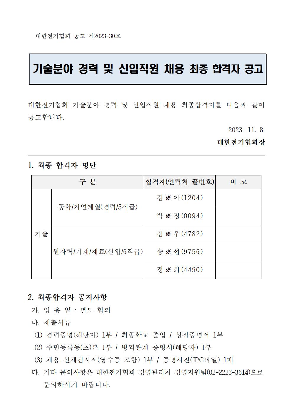 2023-30 : [최종합격자 공고] 기술분야 경력 및 신입직원