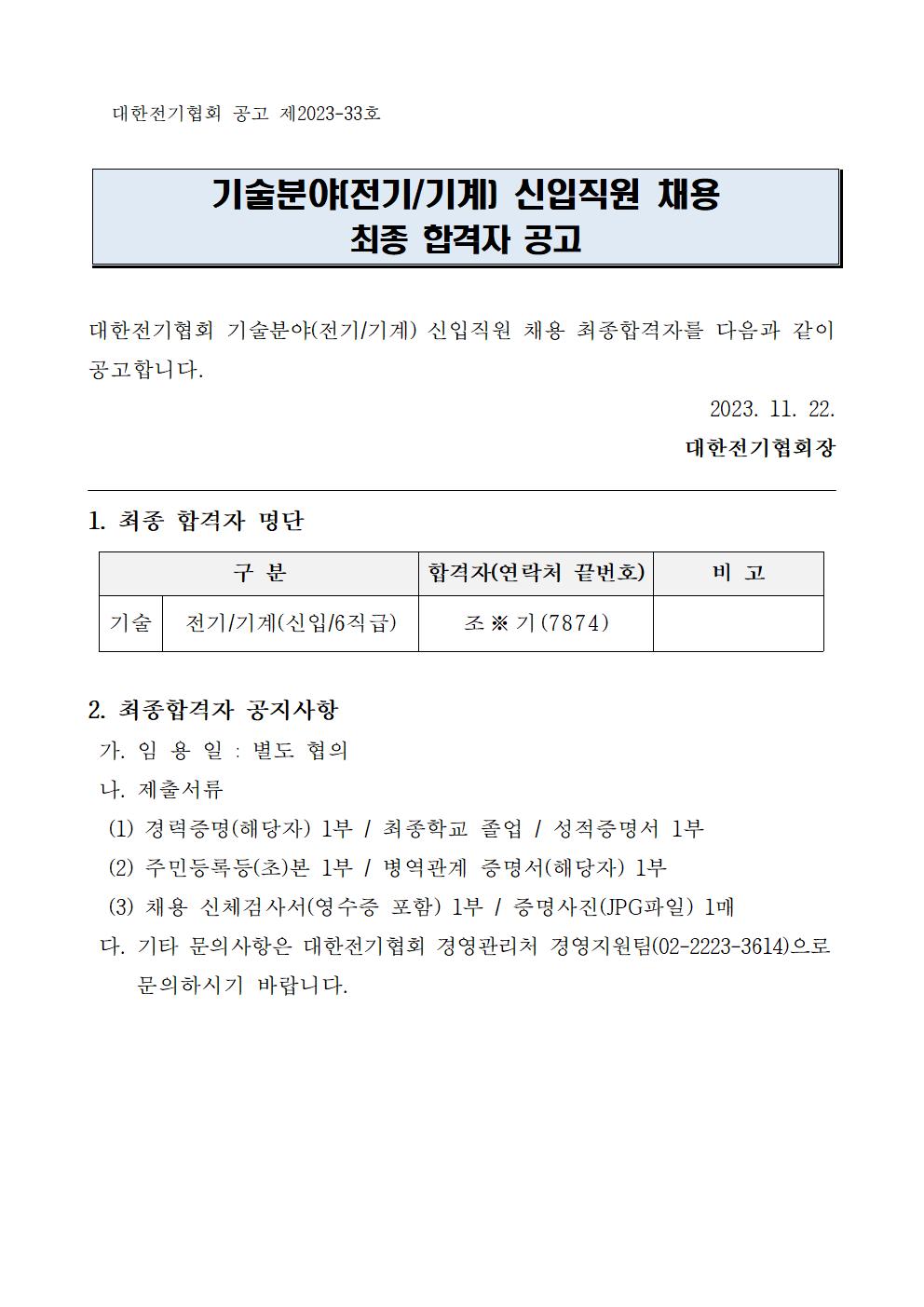 2023-33 : [최종합격자 공고] 기술분야(전기/기계) 신입직원