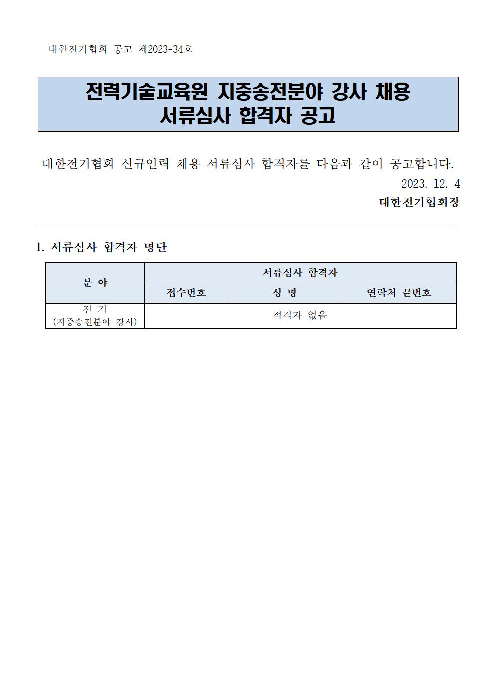 2023-34 : [서류심사 합격자 공고] 전력기술교육원 지중송전분야 강사