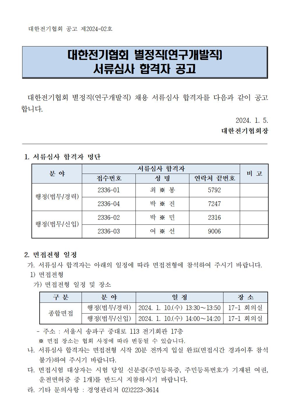 2024-02 : [서류심사 합격자 공고] 별정직(연구개발직)