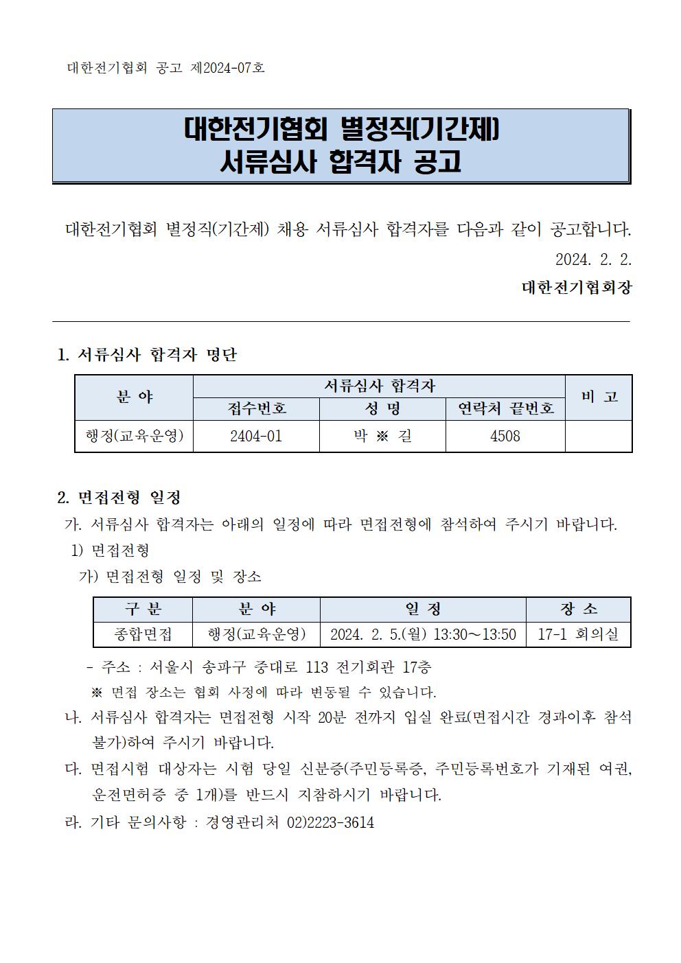 2024-07 : [서류심사 합격자 공고] 별정직(기간제)
