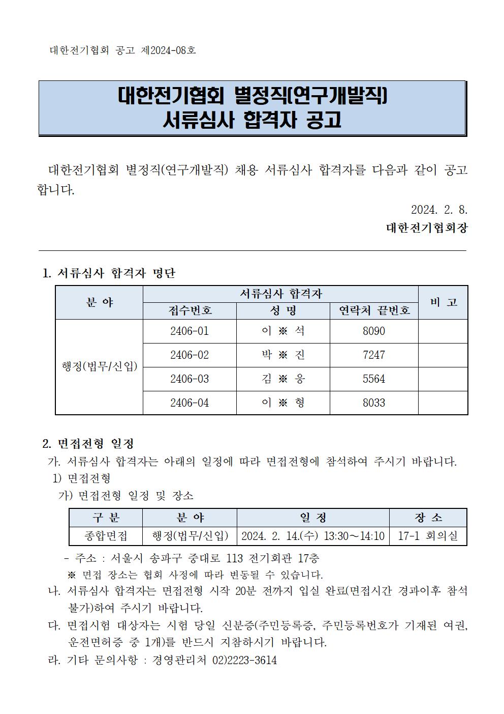 2024-08 : [서류심사 합격자 공고] 별정직(연구개발직)