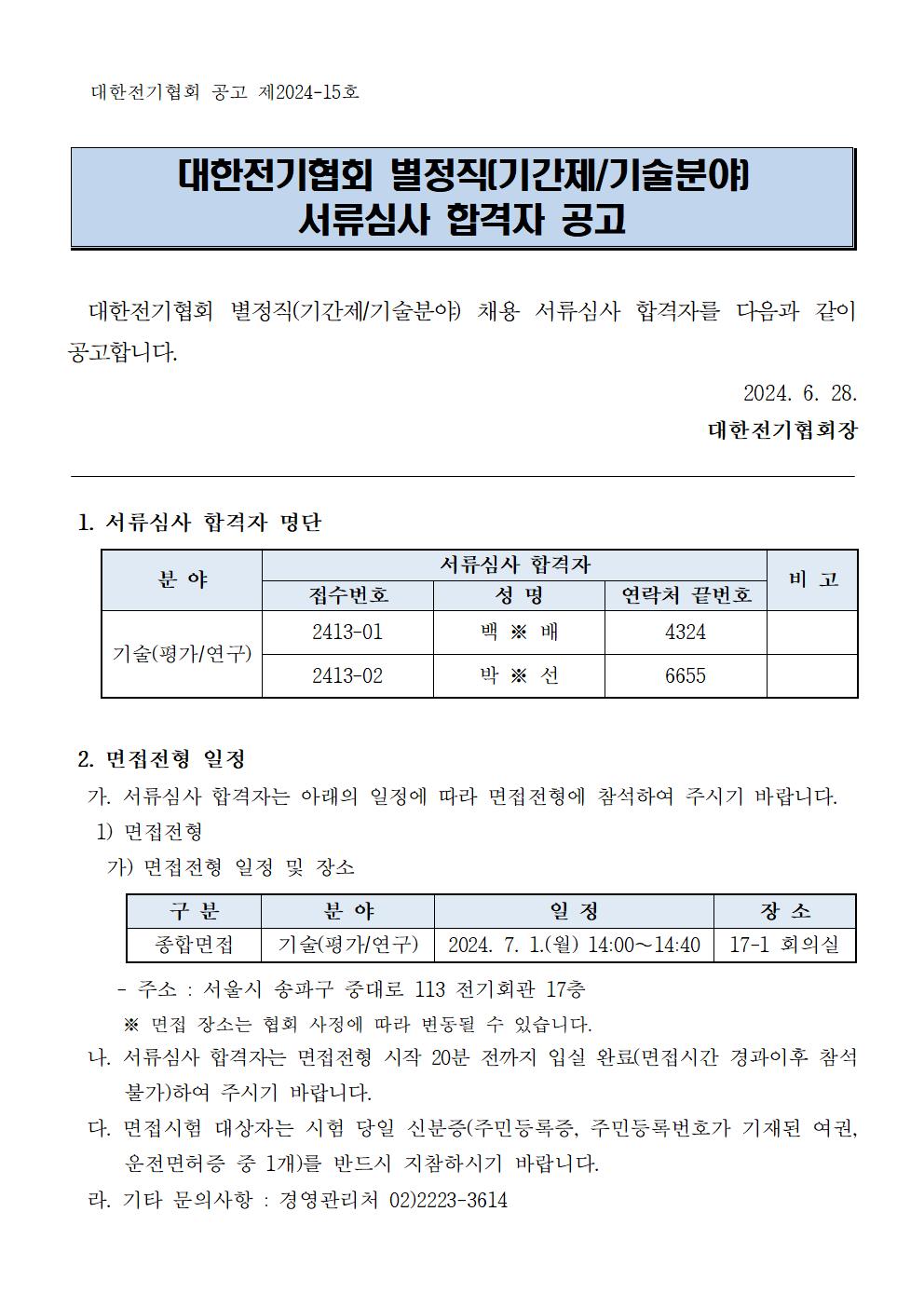 2024-15 : [서류심사 합격자 공고] 별정직(기간제/기술분야)