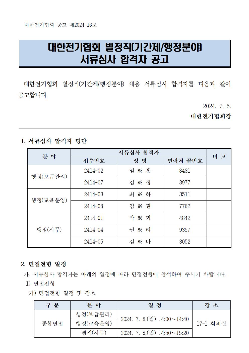 2024-16 : [서류심사 합격자 공고] 별정직(기간제/행정분야)